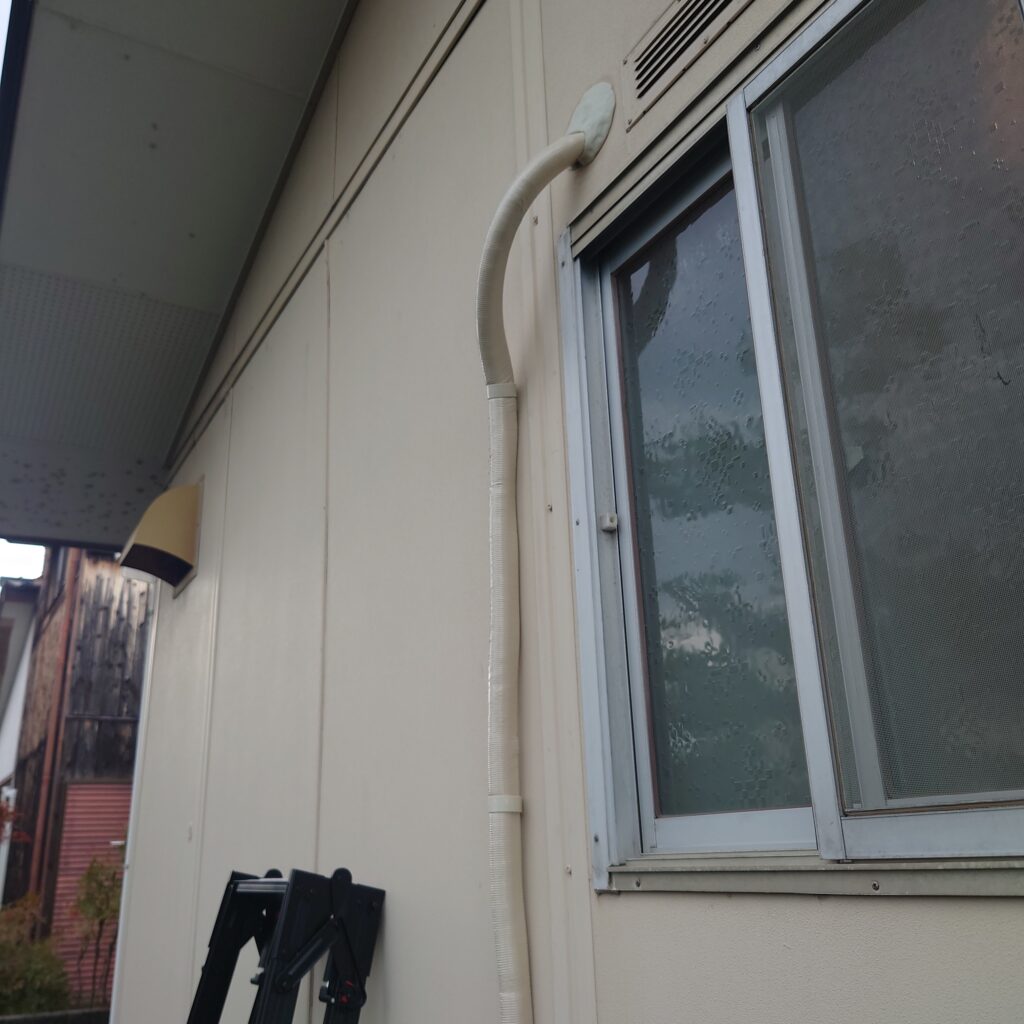 - 貫通スリーブ取り付け (エアコン壁穴の内側から外壁側へ筒状部材を通しトンネルを作り、外気や虫、小動物の侵入を防ぐ施工)