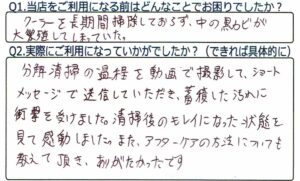 A1. エアコンの内部のよごれが気になる A2. 詳しく説明してくれて、今後のケアのことも教えてくれました。また利用しようと思います。 防府市・チェン子様(完全分解エアコンクリーニング)