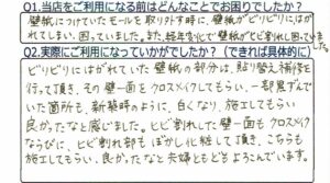A1. 壁紙についていたモールを取り外す時に、壁紙がビリビリにはがれてしまい、困っていました。また、経年変化で壁紙がヒビ割れし困ってました。 A2. ビリビリにはがれていた壁紙の部分は、貼り替え補修を行って頂き、その壁一 […]